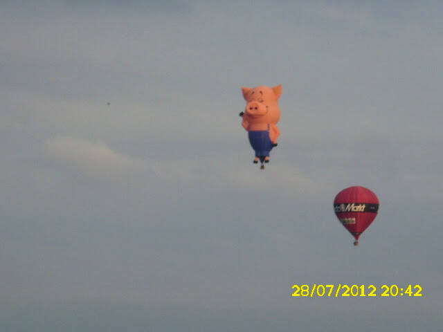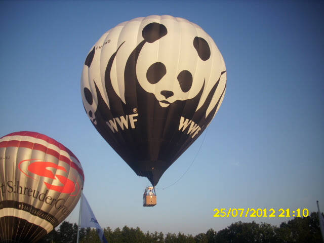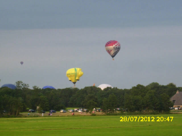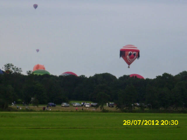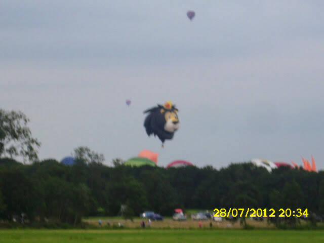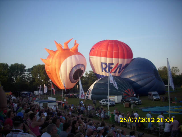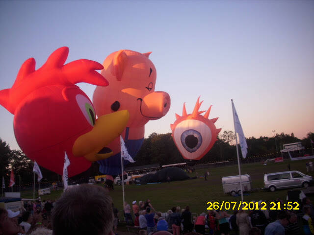 Dag 3: 27 juli 2012: Deze dag leek vanwege de buien afgelast te worden. Dit was ook de reden dat ik er niet bij was. Maar de omstandigheden werden rustiger, daardoor konden ruim 20 ballonnen de lucht in gaan. Hierbij zaten ook verrassend veel Special shapes, namelijk de koffiemok (G-RMUG), de ui (PH-UII), Woody Woodpecker (PP-ZKC), het boerderij varken (PP-XKW), de collectebus (PH-WBD) en de kikker (PH-ROC). De Aston Martin (G-OAML) en de ufo (PH-UVO) werden voor het publiek rechtop gezet.