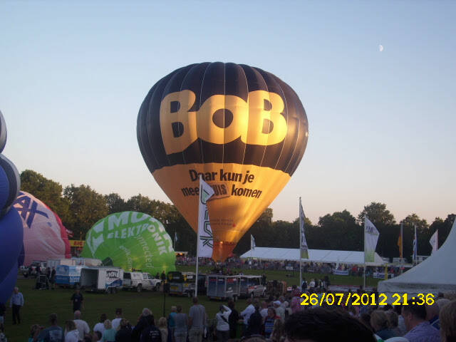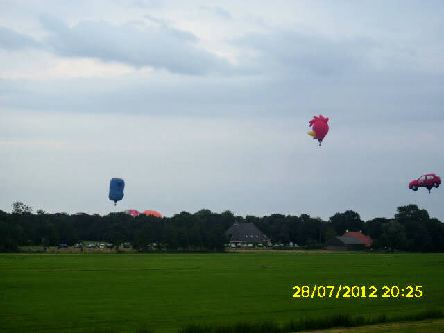 Dag 1: 25 juli 2012: Vorig jaar wilde het weer niet echt meewerken. Dit jaar begon wel geweldig. 30 ballonnen kozen het luchtruim op de openingsdag. Het televisieprogramma WNL Halfacht live zond zelfs even live uit vanaf de Nutsbaan. Een presentatrice steeg op in de eerste ballon, de L (PH-ITS) van Johannes Kooistra. De Nissan Micra (PH-HOS), de kikker (PH-ROC), Simba (PH-HBG), Woodrow (N-908KS) en het Barclays House (G-BWZP) werden voor het publiek rechtop gezet.