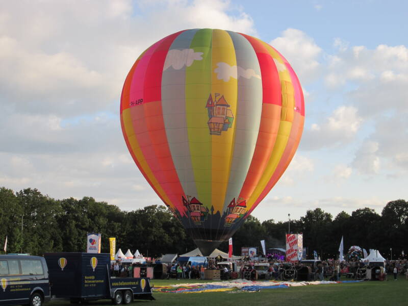 Hier staat de ballon klaar voor zijn - achteraf - laatste vaart vanaf de Friese Ballonfeesten. Op de zaterdagavond van de Ballonfeesten in 2023.