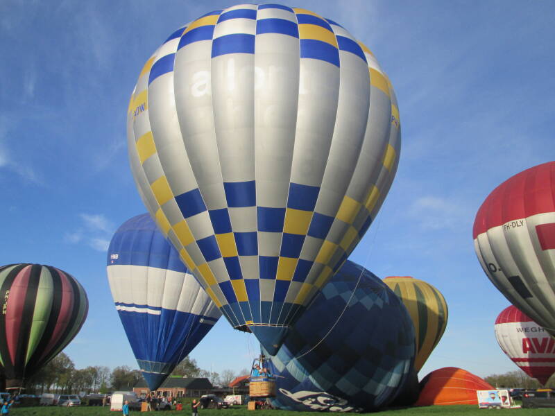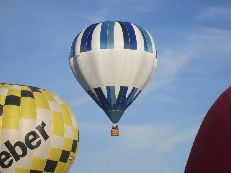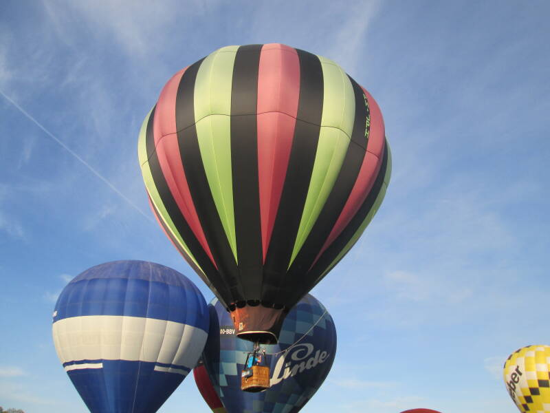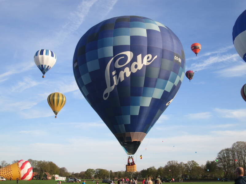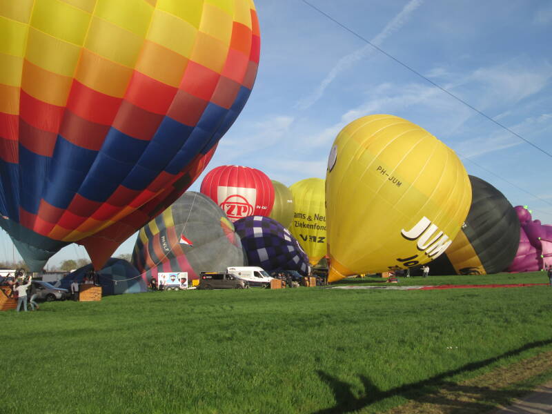 De eerste luchtballon van de avond. Om deze ballon zie je allemaal heliumballonnetjes. Deze werden door middel van een boutje op de grond gehouden. De piloten moesten proberen om een van de heliumballonnen te pakken.